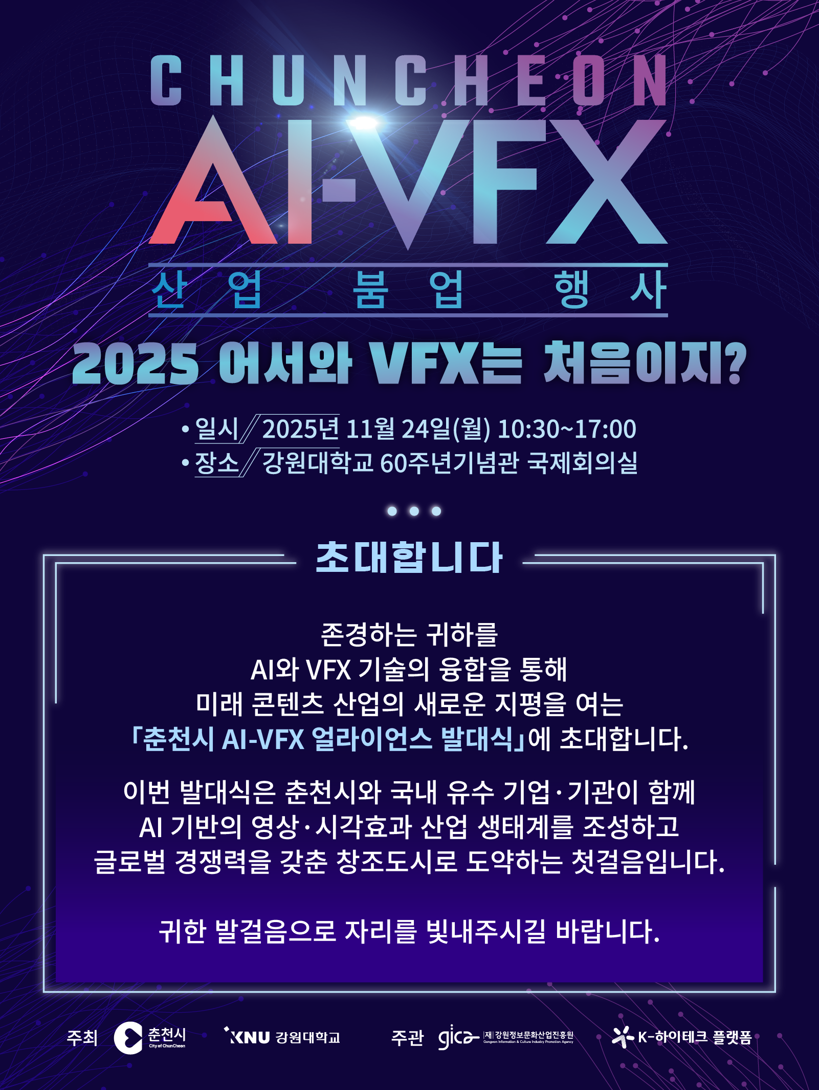 K-하이테크 플랫폼 사업단은 강원대학교(산학협력단)와 춘천시(강원정보문화산업진흥원)가 협력하여 AI-VFX 산업 활성화를 위한 산·관·학 연계 기반을 강화하고, 미래인재의 산업 인식 제고 및 홍보를 위한「춘천 AI-VFX 산업 붐업 행사」를 다음과 같이 운영하고자 합니다.